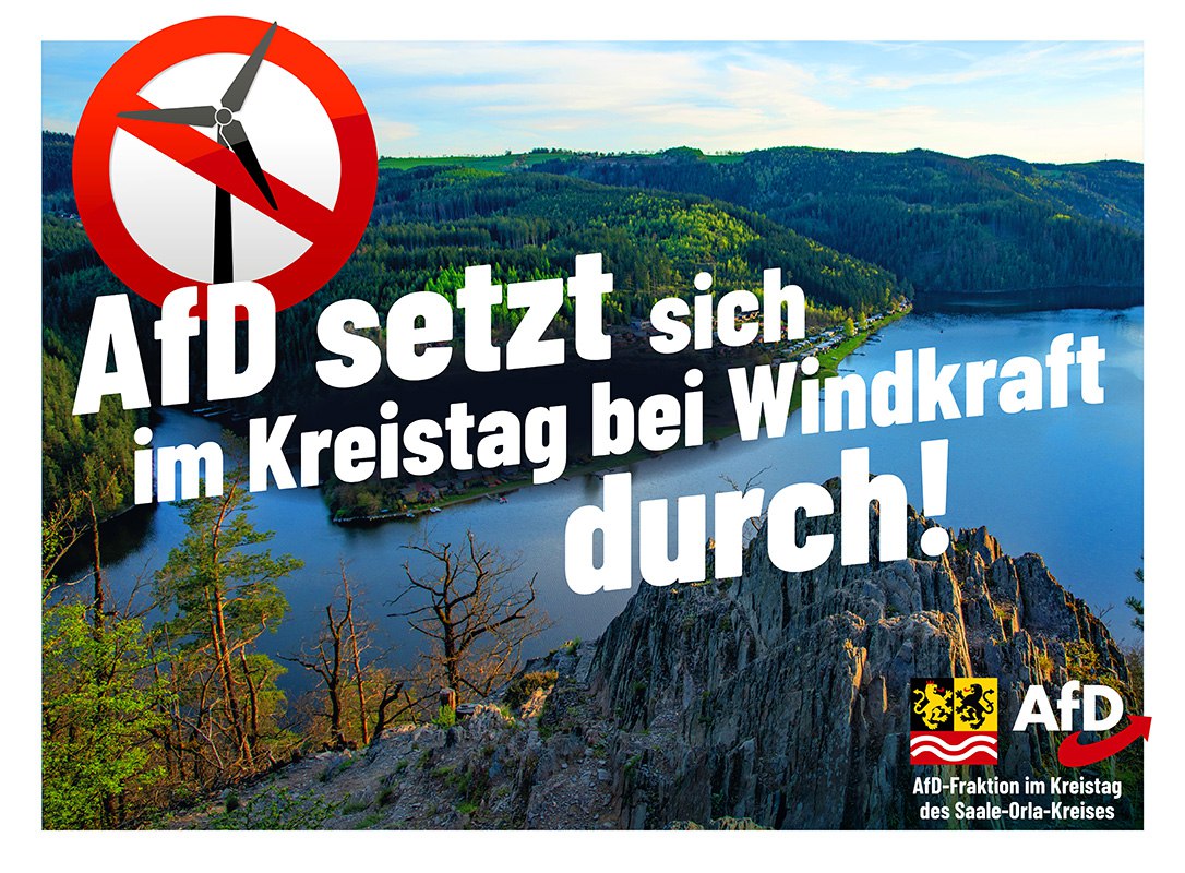Nach mehrmaligen Anläufen ist es unserer Kreistagsfraktion mit diesem Beschluss nun endlich gelungen, ein Zeichen der Hoffnung und Vernunft in Sachen Naturschutz zu setzen. Bei zwei Gegenstimmen aus den Reihen der CDU-Fraktion und der gesamten rot-rot-grünen Fraktion konnte eine Mehrheit sich hinter unsere Erklärung stellen, dass zwei Prozent der Fläche des Saale-Orla-Kreises für Windindustrieanlagen unrealistisch ist und erheblich negative Folgen für unsere Landschaft hat.