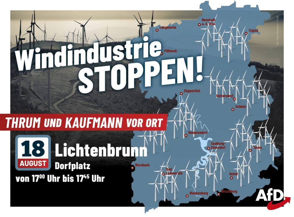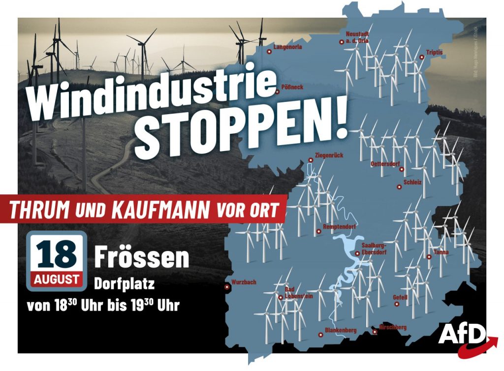 Durch den aktuellen Entwurf über die Ausweisung neuer Windvorranggebiete im Saale-Orla-Kreis muss sich jetzt eine neue Welle des Bürgerprotestes begründen. Die CDU geführte Landes- und Bundesregierung macht trotz vollmundiger Wahlkampfversprechen keine Anstalten, die Gesetze zum Windindustrieausbau zurückzunehmen. Bevor dem Bürger die Chance an der Wahlurne für einen vollständigen Politikwechsel gegeben wird, wollen wir vor Ort über Handlungsmöglichkeiten informieren. Hierfür werden wir am 18. August 2025 zunächst von 15:30-16:15 Uhr auf dem Marktplatz in Thimmendorf, anschließend von 17:00-17:45 Uhr in Lichtenbrunn auf dem Dorfplatz und abschließend in Frössen von 18:30-19:30 Uhr auf dem Dorfplatz anzutreffen sein. Darüber hinaus wird es am 25. August 2025 von 17:00-18:00 Uhr in Gahma am Dorfteich und von 18:30-19:30 Uhr in Liebengrün an der Wartehalle sowie am 26. August 2025 zunächst ab 17 Uhr in Rödersdorf auf dem Dorfplatz und ab 18:30 Uhr in Oettersdorf am Denkmal eine Informationsveranstaltung zum Thema Windindustrieausbau geben.
