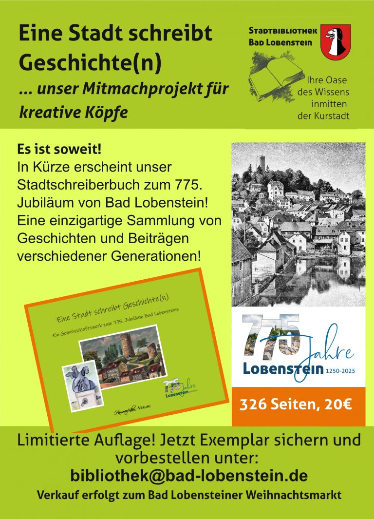 Wer sich jetzt schon ein Exemplar sichern möchte, kann dies gern in der Bibliothek unter 036651 2076 oder per Mail  an bibliothek@bad-lobenstein.de zum Preis von 20€ vorbestellen!