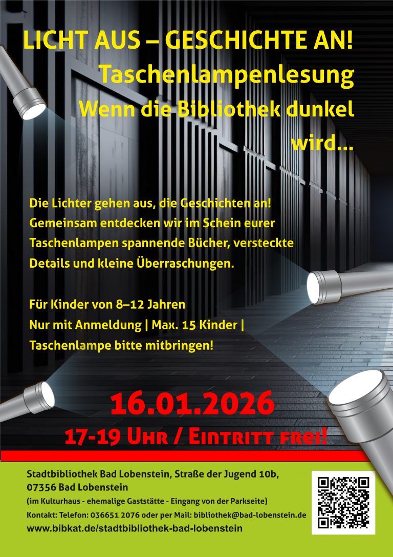 Am Freitag, den 16.01.2026, lädt die Stadtbibliothek Bad Lobenstein von 17 bis 19 Uhr zu einer besonderen Veranstaltung für Kinder im Alter von 8 bis 12 Jahren ein: einer spannenden Taschenlampenlesung.