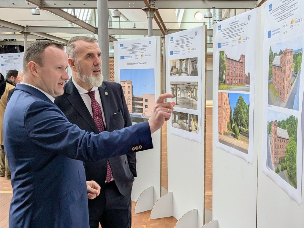Landrat Christian Herrgott schloss sich den Worten des Ministers an und erinnerte daran, dass Denkmalschutz nicht die Aufgabe habe, leere Hüllen zu bewahren, sondern historische Bausubstanz mit neuem Leben zu erfüllen. „Das ist uns hier beim neuen Bildungszentrum in Pößneck sehr gut gelungen. Für den Landkreis ist es wichtig, dass wir uns gemeinsam gut für die Zukunft aufstellen, Projekte nach vorn entwickeln und Unstimmigkeiten aus der Vergangenheit endgültig aus dem Weg räumen“, betonte er bei der Vorstellung der Pläne für das M2-Gebäude.