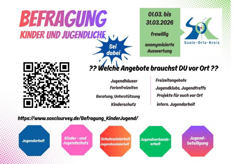 In einer anonymen Online-Umfrage sind alle im Alter von 10 bis 27 Jahren dazu aufgerufen, Auskunft über ihre Wünsche für die Freizeitgestaltung, die Bekanntheit oder sogar Nutzung bereits vorhandener Angebote von Jugendhäusern oder Vereinen, den Umgang mit Medien sowie ihr Wissen in Bezug auf Zukunftsperspektiven und Mitbestimmungsmöglichkeiten in ihrem Wohnort zu geben. Die Befragung wird in Zusammenarbeit mit den weiterführenden Schulen, den Schulsozialarbeitern, den Jugendhäusern des Saale-Orla-Kreises und dem Jugendparlament durchgeführt.