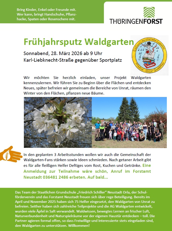Neustadt/Orla. In Zusammenarbeit mit ThüringenForst, der Friedrich-Schiller-Grundschule und der Stadt Neustadt an der Orla betreuen wir seit Anfang 2025 gemeinsam das Projekt „Waldgarten Neustadt“. Auf den Flächen, die von der Stadt gestellt worden sind, betreiben wir für die kommenden 10 Jahre einen gemeinschaftlich bewirtschafteten Waldgarten, …mit Streuobstwiese und Baumschule, der für jedermann zugänglich sein soll.