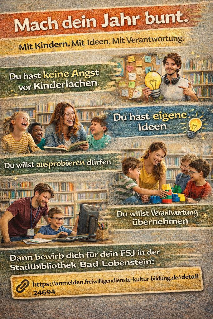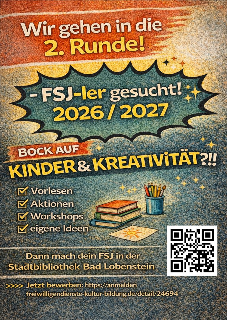 Wir gehen in die 2. Runde – FSJ-ler für 2026/2027 gesucht! FSJ Kultur & Bildung in der Stadtbibliothek Bad Lobenstein