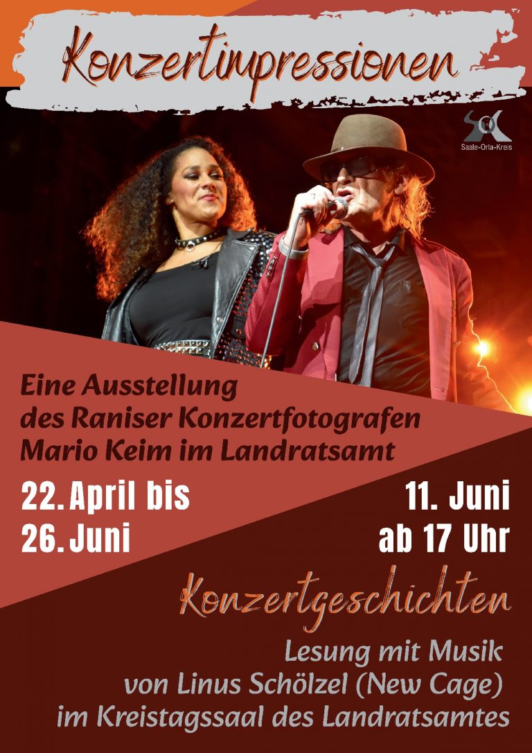 Ergänzend zur Fotoausstellung findet am Donnerstag, 11. Juni, um 17 Uhr im Kreistagssaal des Landratsamtes in Schleiz eine Lesung mit Mario Keim statt, bei der er sein 2024 erschienenes Buch „Konzertgeschichten: von AC/DC bis ZZ Top“ vorstellt. Es ist ein Konzerttagebuch, das stilübergreifend Anekdoten und Fakten rund um das Musikgeschehen auf Bühnen in Deutschland und Österreich versammelt. Für die passende musikalische Untermalung der Lesung sorgt der aus Schleiz stammende Musiker Linus Schölzel von der aufstrebenden Band New Cage, die ebenfalls von Mario Keim bei Konzerten fotografisch begleitet wurde. Der Eintritt zur Lesung ist frei. Um vorherige Anmeldung per E-Mail an: gleichstellung@lrasok.thueringen.de wird gebeten.