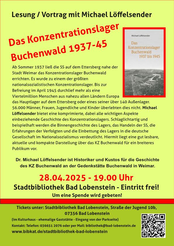 Der Historiker Michael Löffelsender liest aus seinem Buch „Das Konzentrationslager Buchenwald 1937 bis 1945“. Anlässlich des 80. Jahrestags der Befreiung beleuchtet der Autor die Geschichte eines der größten nationalsozialistischen Konzentrationslager. In kompakter Form stellt er zentrale Entwicklungen und Zusammenhänge dar – von der Errichtung des Lagers 1937 auf dem Ettersberg bei Weimar bis zur Befreiung im April 1945. Dabei werden sowohl die Perspektiven der Häftlinge als auch das Handeln der SS und die Einbettung des Lagers in die nationalsozialistische Gesellschaft thematisiert. Michael Löffelsender ist Historiker und Kustos an der Gedenkstätte Buchenwald.