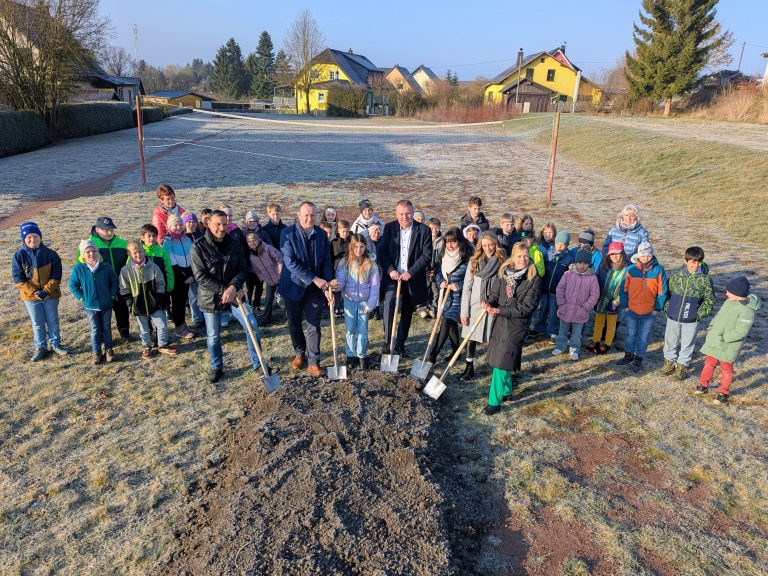 Schleiz. In Gefell entsteht in direkter Nähe zur Grundschule eine neue Kleinsportanlage für den Schul- und Freizeitsport. Den Spatenstich hierfür vollzogen Landrat Christian Herrgott und der Gefeller Bürgermeister Marcel Zapf zusammen mit Vertreterinnen und Vertretern der Grundschule sowie des städtischen Bauamtes und der bauausführenden Firma am 2. April. Auch die Schülerinnen und Schüler der Klassenstufe 3 ließen sich dieses Ereignis nicht entgehen.