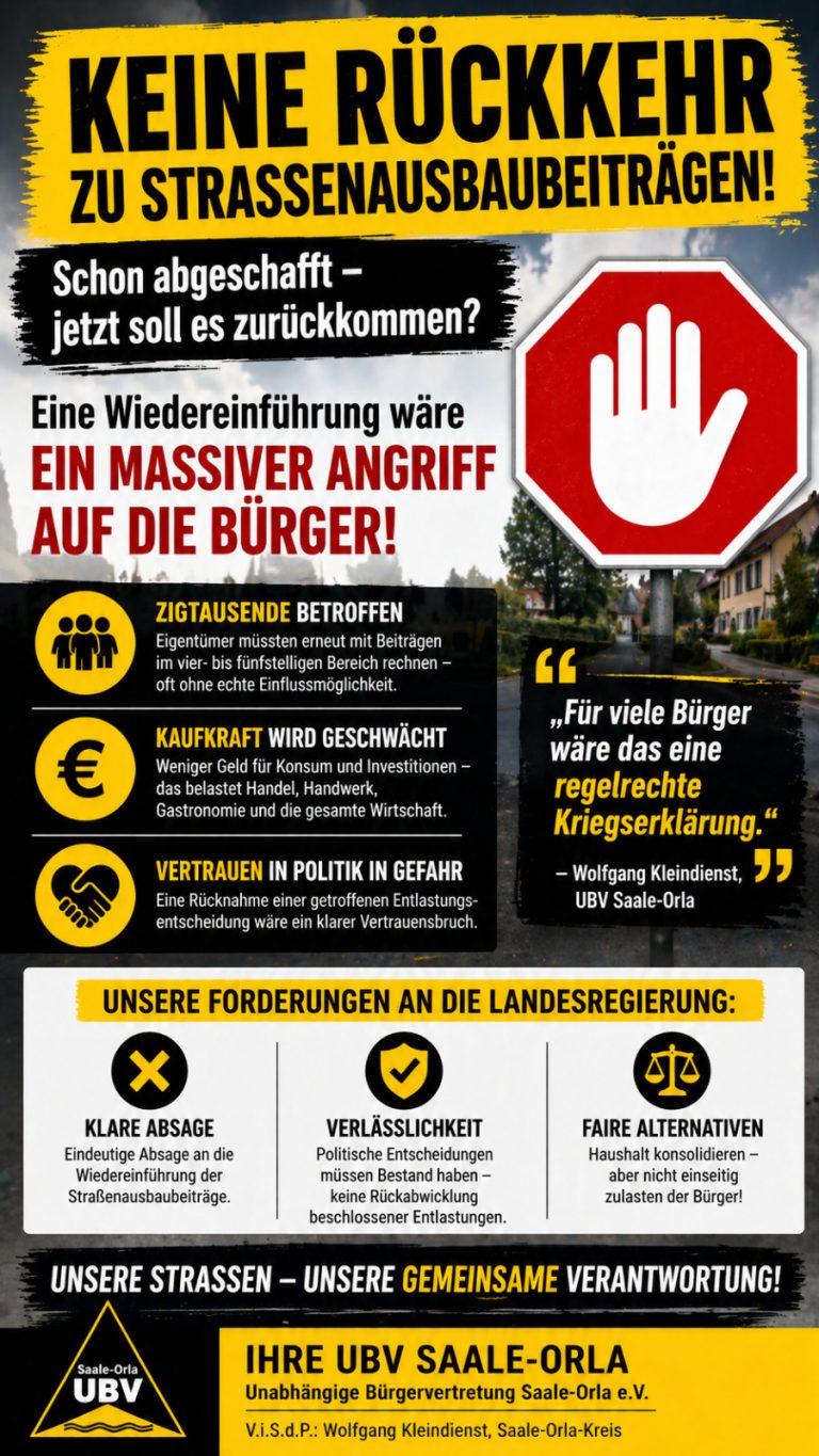 Die Unabhängige Bürgervertretung Saale-Orla (UBV) hat einen offenen Brief an den Thüringer Ministerpräsidenten sowie an alle Fraktionen des Landtages versandt und darin eindringlich vor einer möglichen Wiedereinführung der Straßenausbaubeiträge (SAB) gewarnt. Hintergrund sind aktuelle Diskussionen innerhalb der Landesregierung und der Haushaltsstrukturkommission, in denen eine Rückkehr zu den 2019 abgeschafften Beiträgen zumindest geprüft wird.