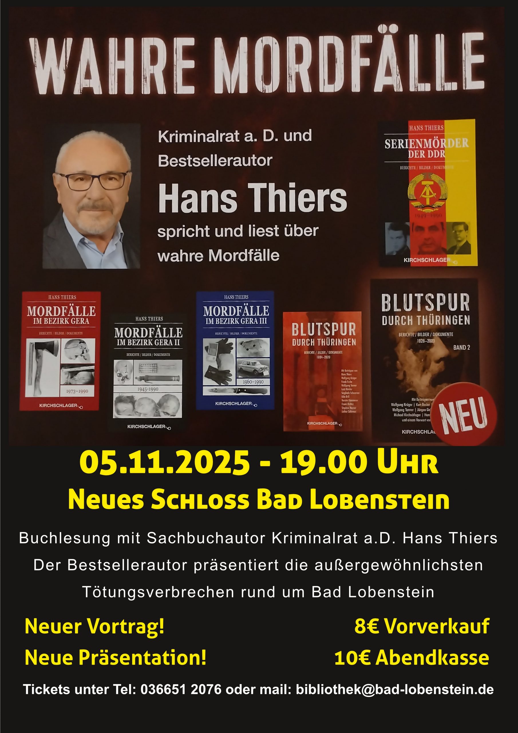 05.11.2025 – 19 Uhr, Neues Schloss, ein Veranstaltungshinweis des Förder-und Freizeitverein Stadtbibliothek Bad Lobenstein Kriminalrat a.D. und Erfolgsautor Hans Thiers dokumentiert mit seiner „Power-Point-Präsentation“ authentische Mordfälle rund um die