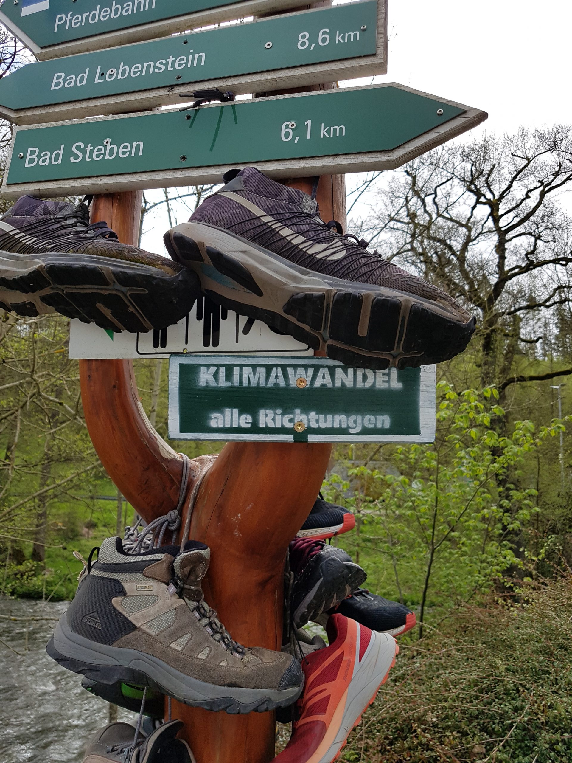 Der Klimawandel scheint auch in Blankenstein angekommen zu sein. Zumindest wird man am Rennsteig-Beginn bzw. -Ende darauf hingewiesen. „KLIMAWANDEL alle Richtungen“ heißt es dort auf einem Hinweisschild, welches an einem