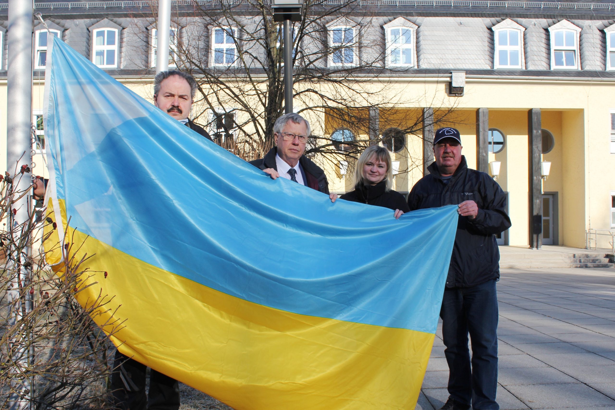 Wie das Landratsamt mitteilt, weht seit Donnerstag, kurz nach neun Uhr morgens, die blau-gelbe Flagge der Ukraine vor dem Landratsamt des Saale-Orla-Kreises in Schleiz. Die Kreisverwaltung will damit ein Zeichen